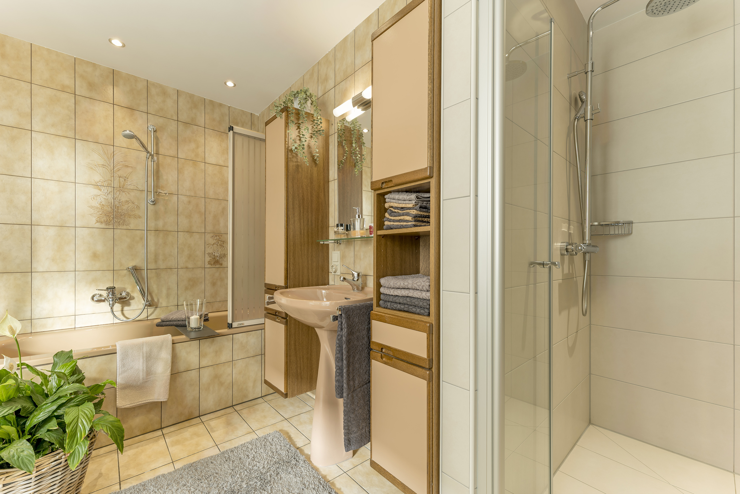 Neben einer grossen barrierefreien Dusche, gibt es auch eine grosszügige Wanne.