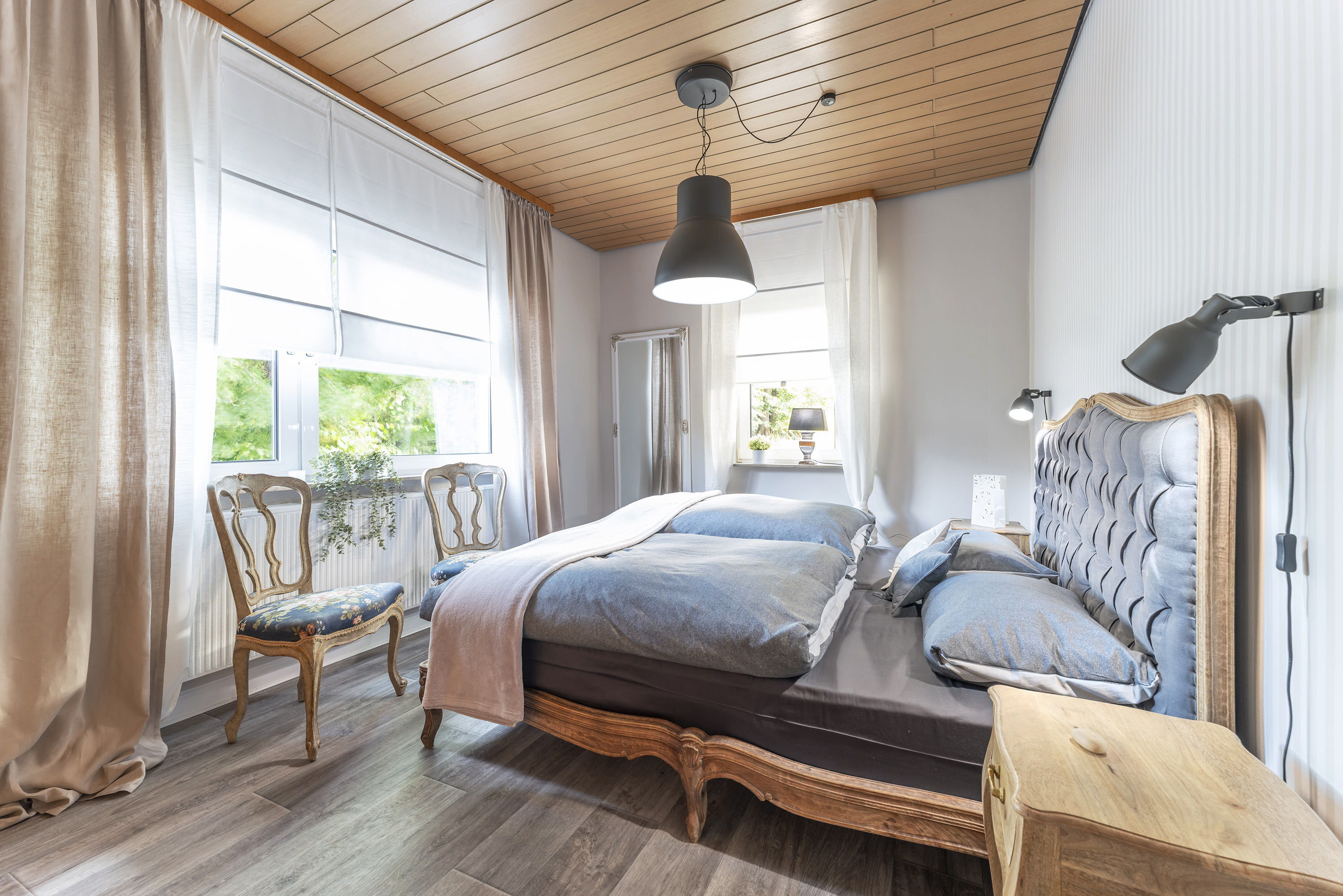 Doppelbett, Kleiderschrank, Bettdecken, Kissen, Bettzeug.